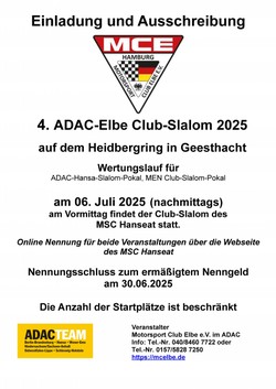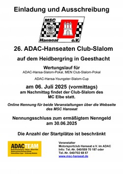 Hier finden Sie alle Unterlagen zu den Club-Slalom-Veranstaltungen des MSC Hanseat und des MC Elbe am 06. Juli 2025 | |